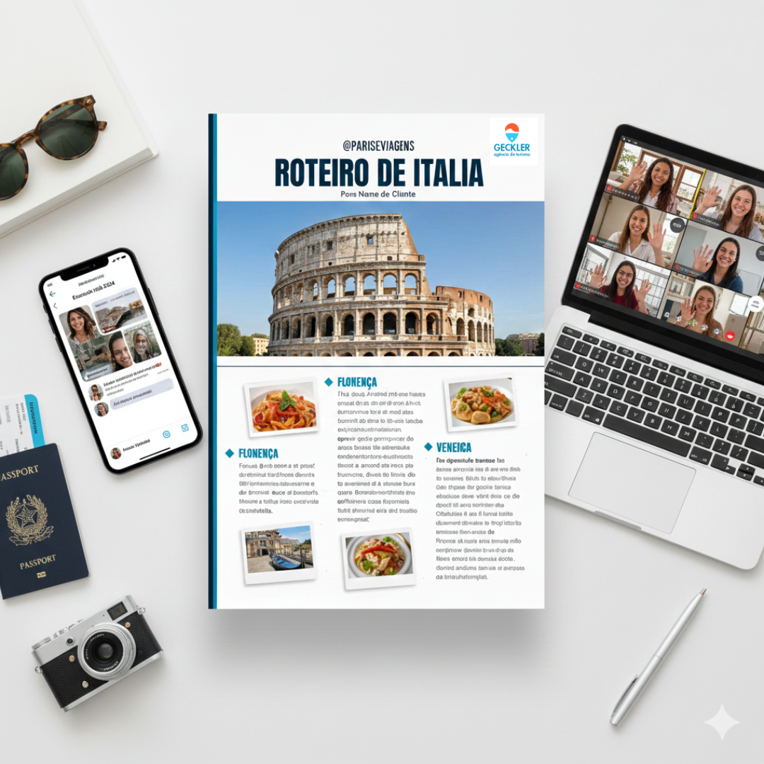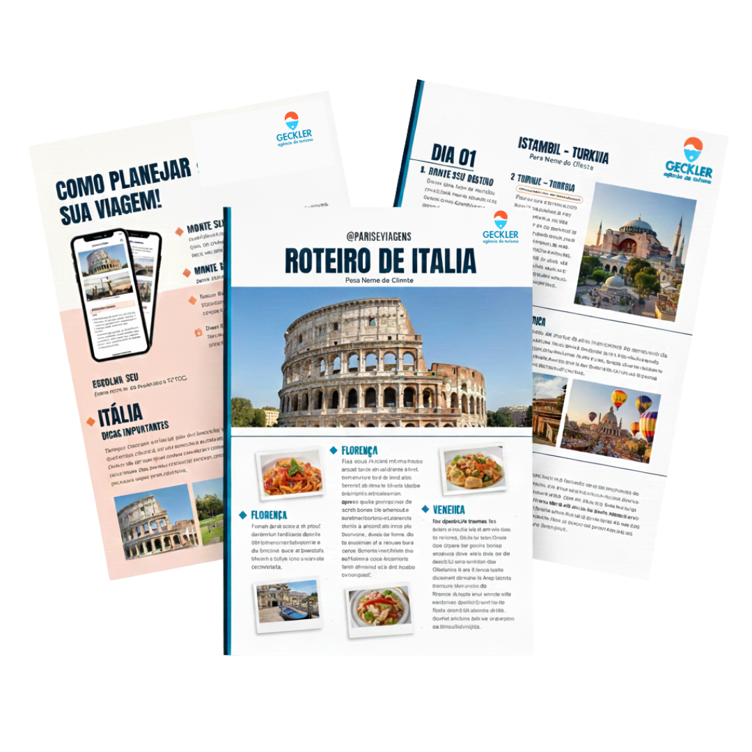 Após uma consultoria gratuita de 20 minutos, a Geckler cria um roteiro de viagem 100% personalizado, cuidando de passagens aéreas, hospedagens, passeios, transportes e toda a logística entre cidades, sempre respeitando seu orçamento. Você recebe assessoria completa em documentação, imigração, vacinas, câmbio e chip internacional, além de suporte em tempo real durante a viagem, com total transparência e sem comissão de fornecedores. Viagem sem ruído, planejada no modo expert.